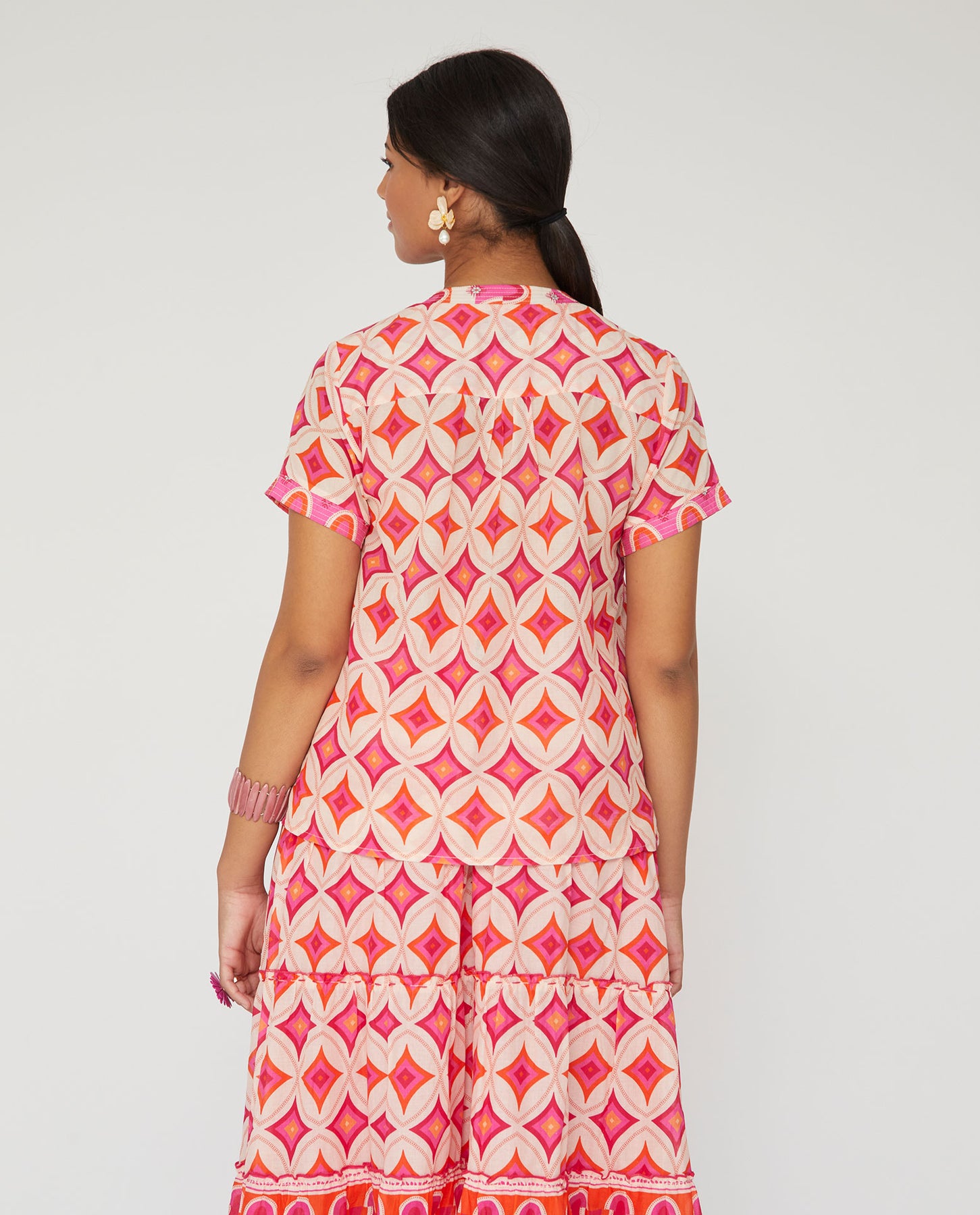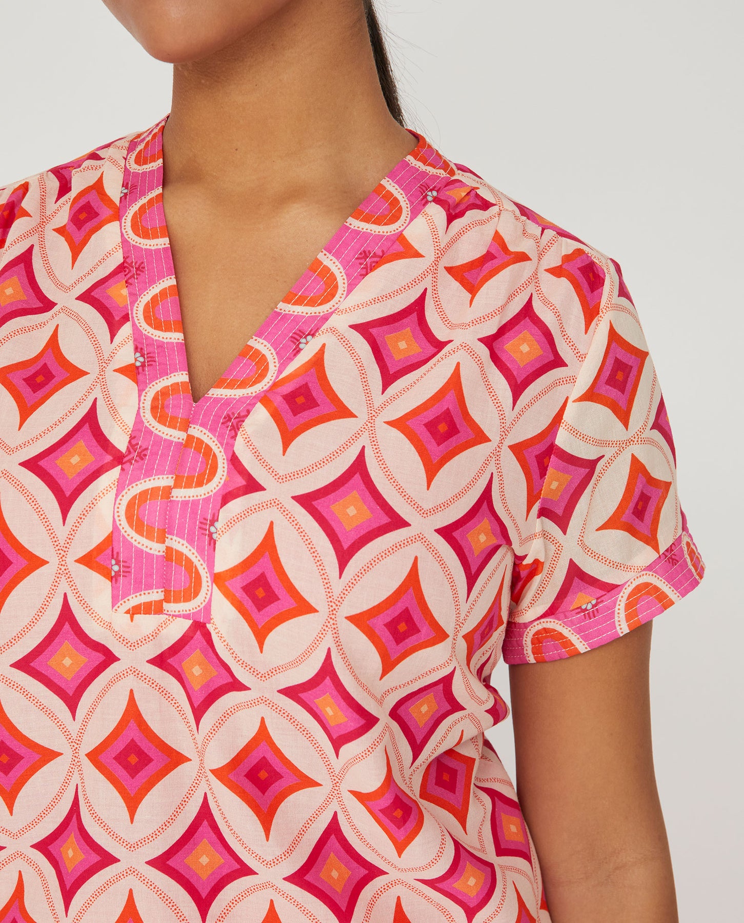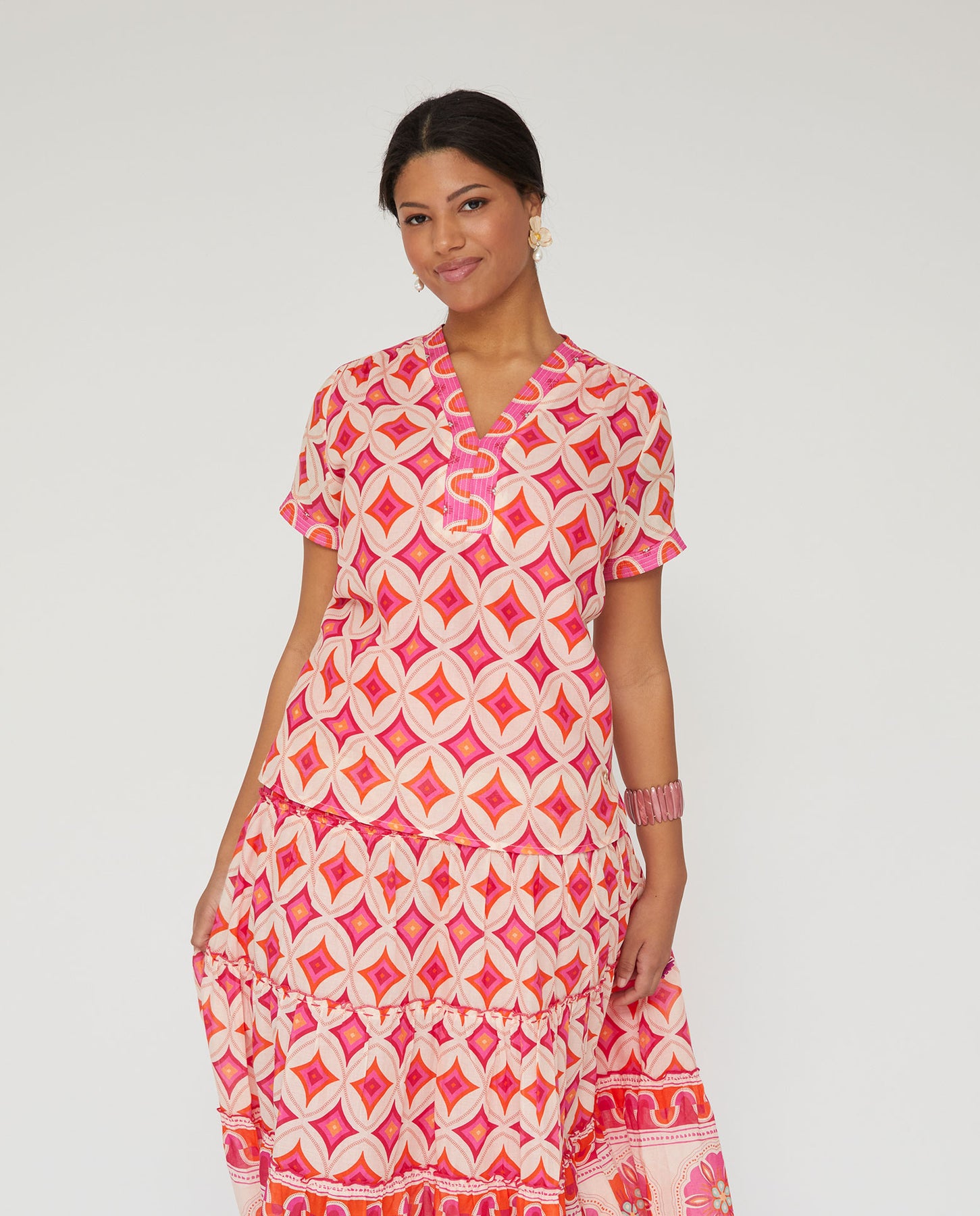 Blusa estampada. Escote de pico y manga corta.