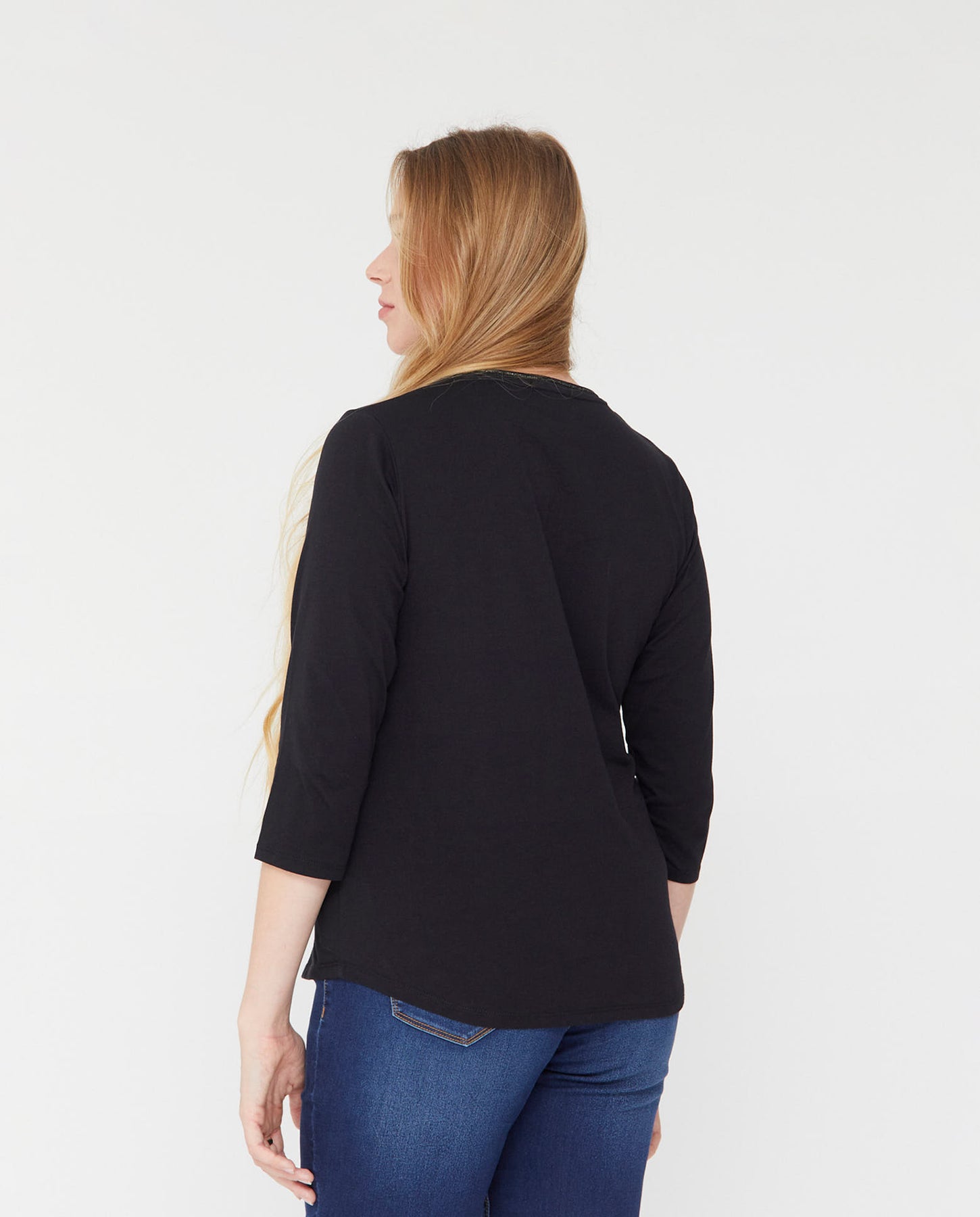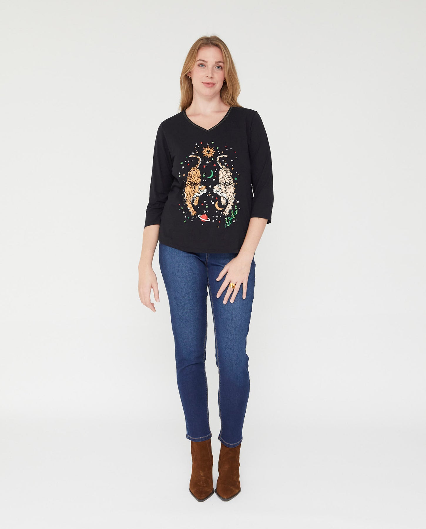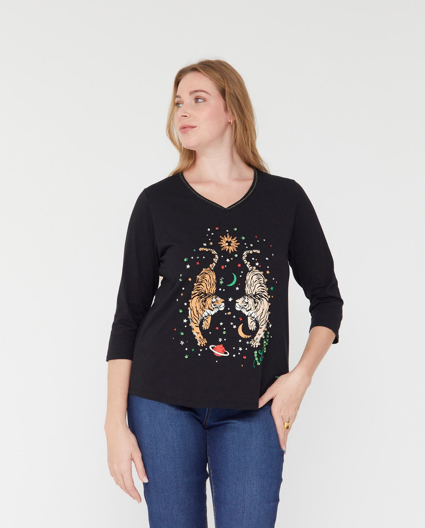Camiseta escote pico y manga 3/4. Estampado posicional en delantero con aplicación de piedras.