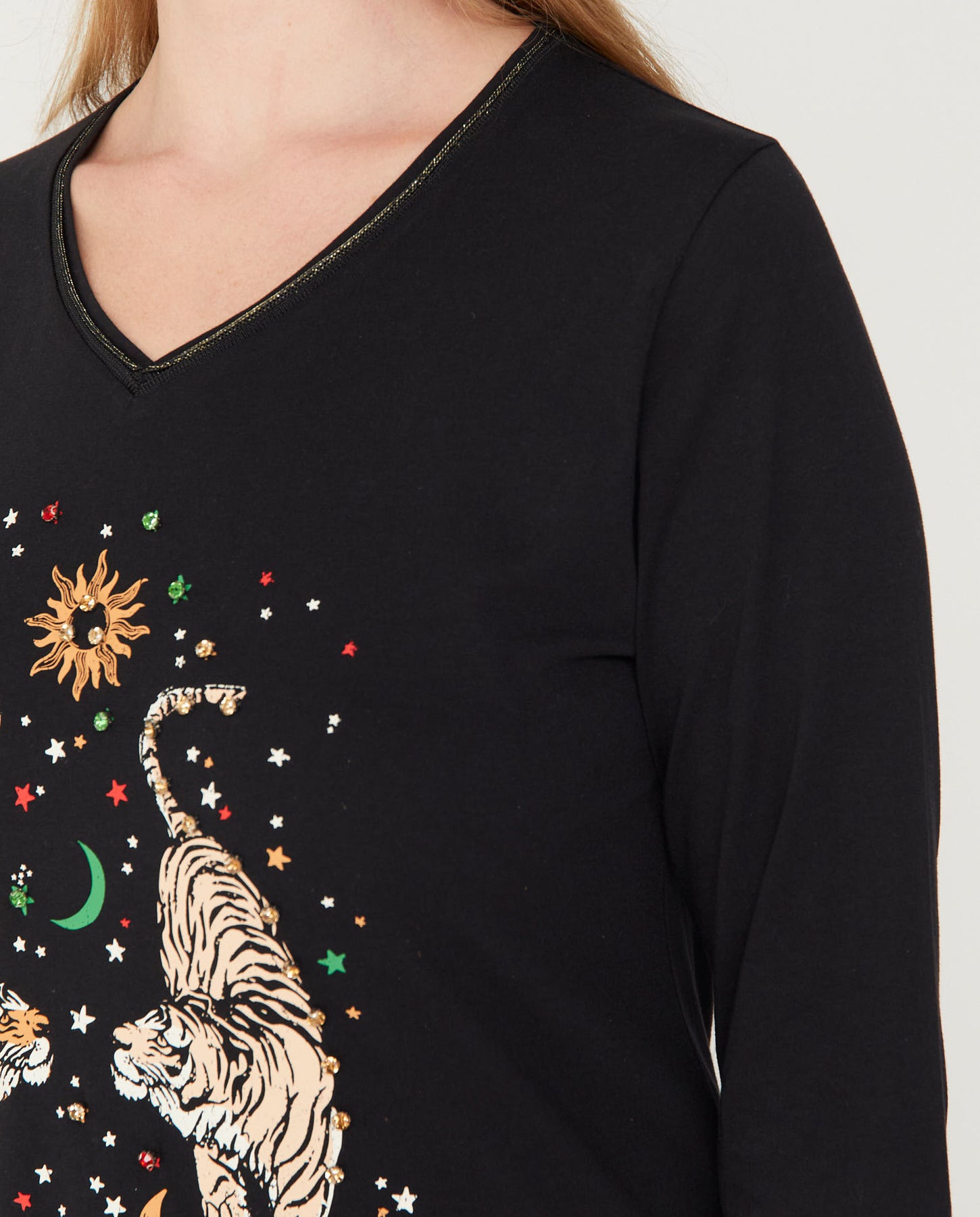 Camiseta Cuello Pico Estampado Y Piedras  Negro