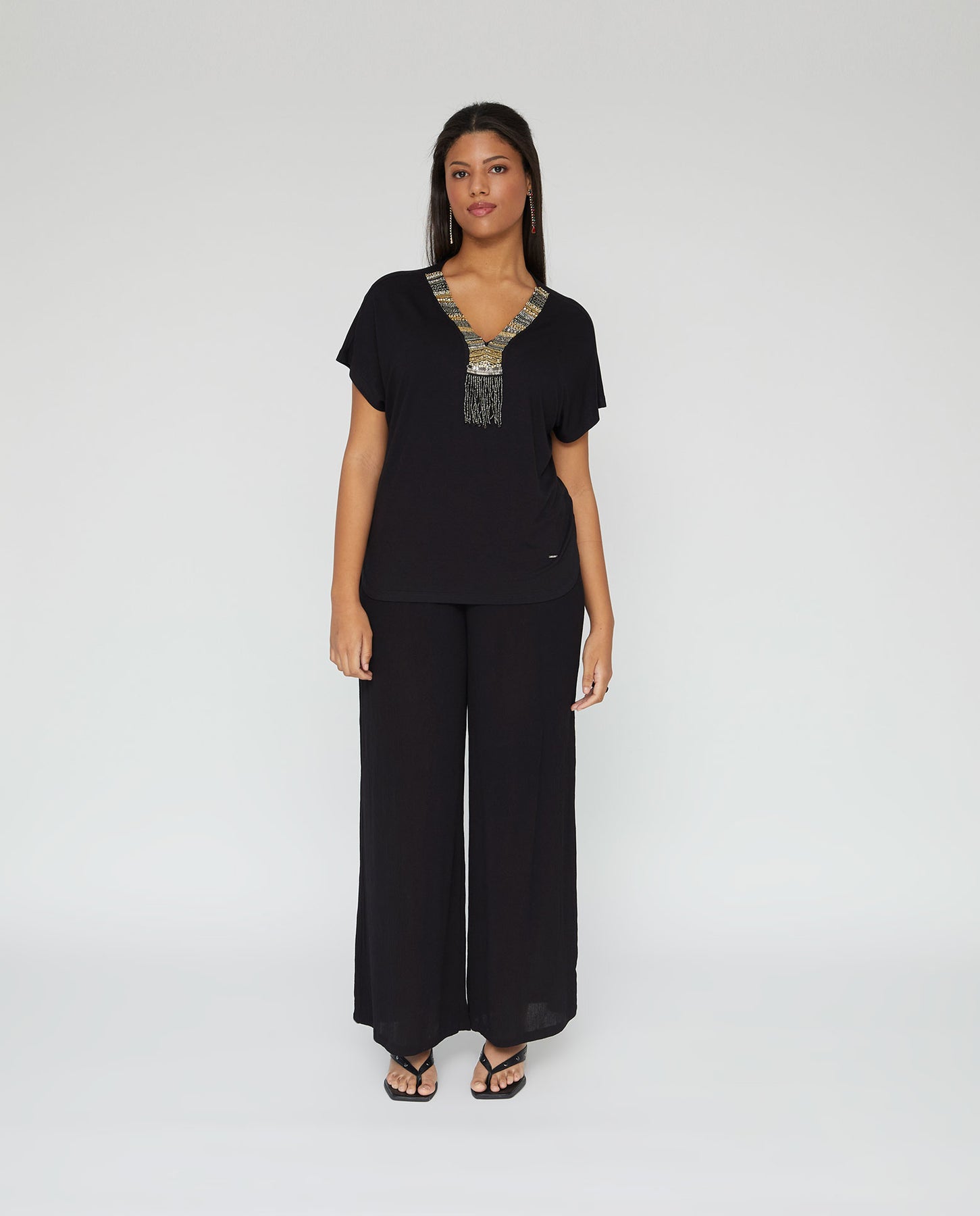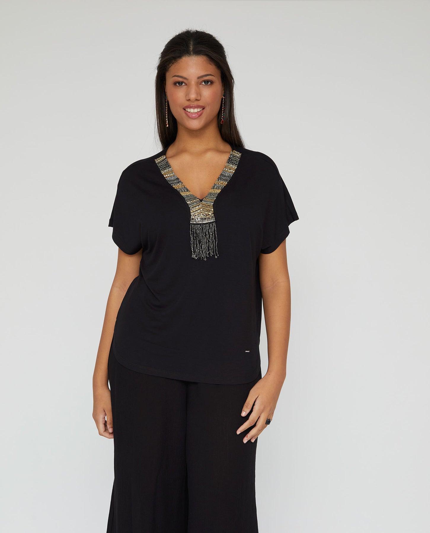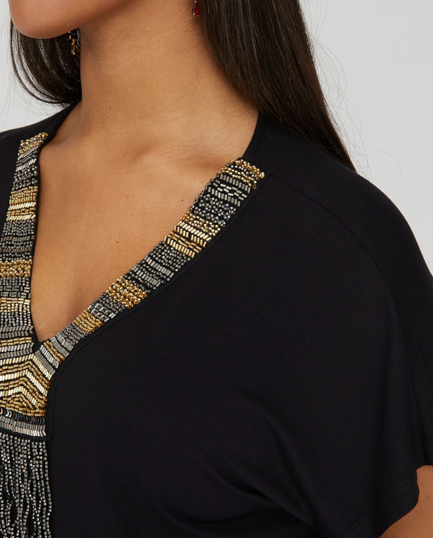 Camiseta con escote en pico, hombro caído. Aplicación de abalorios en el escote.