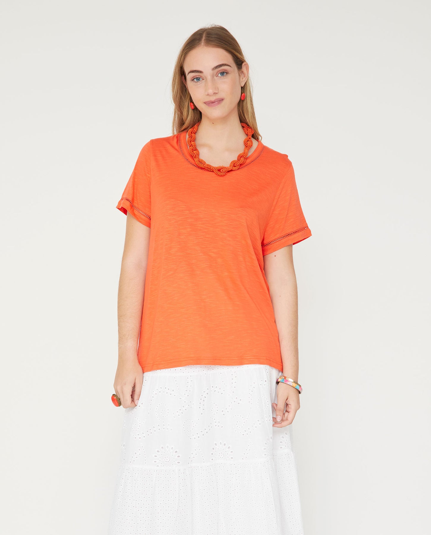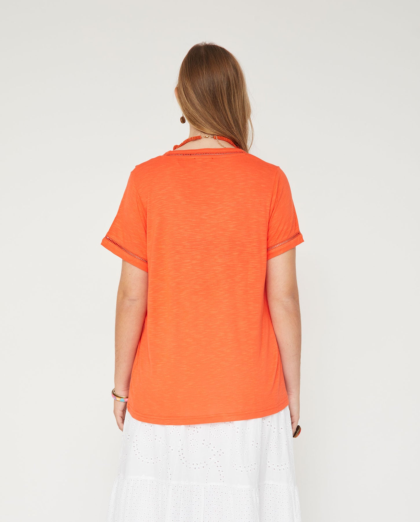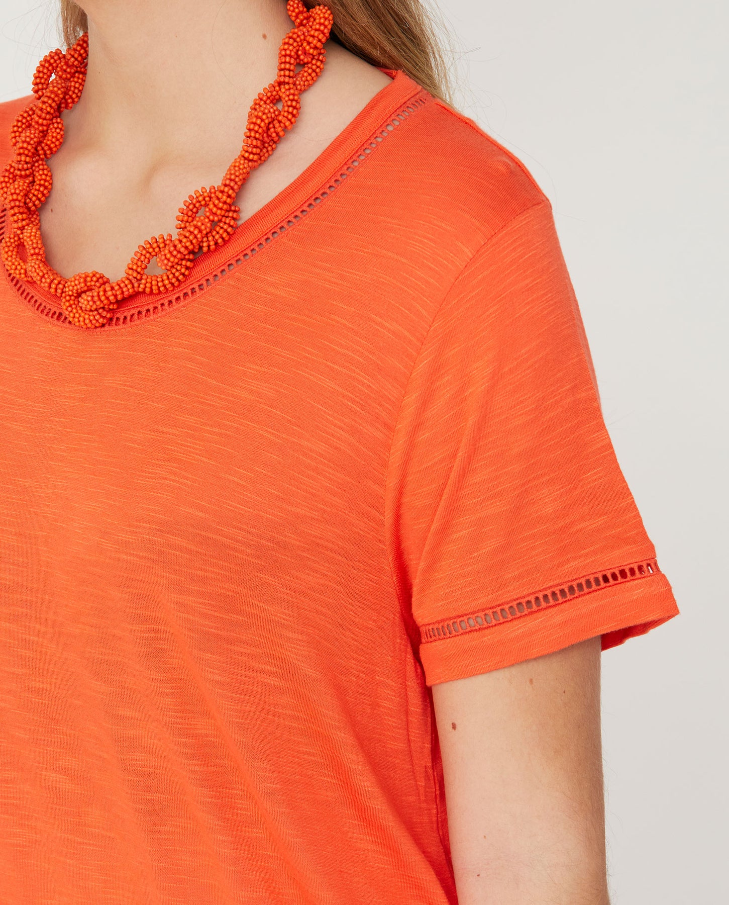 Camiseta Escote Pico Con Entredos Coral