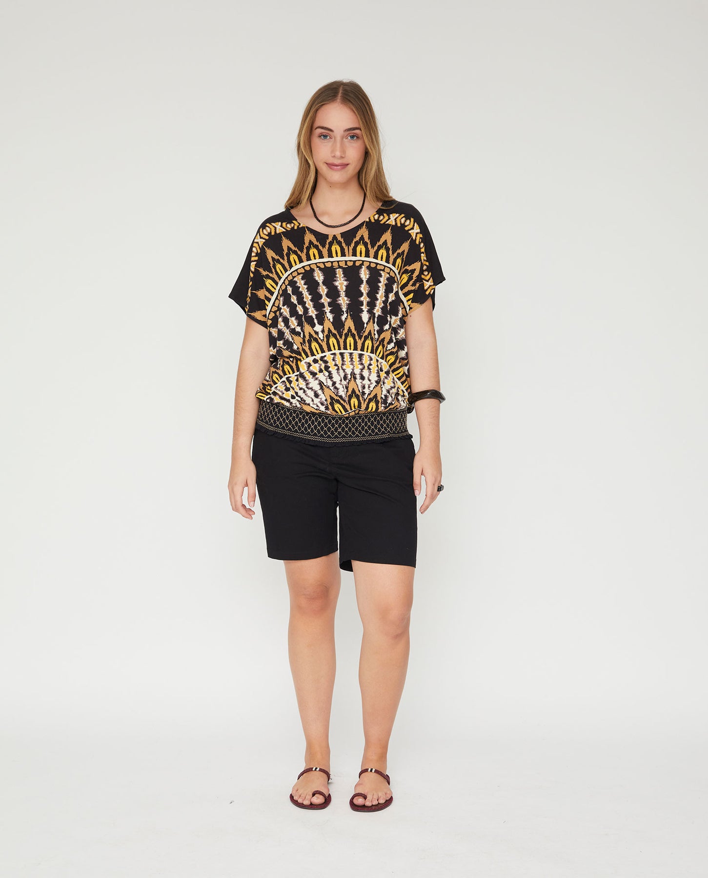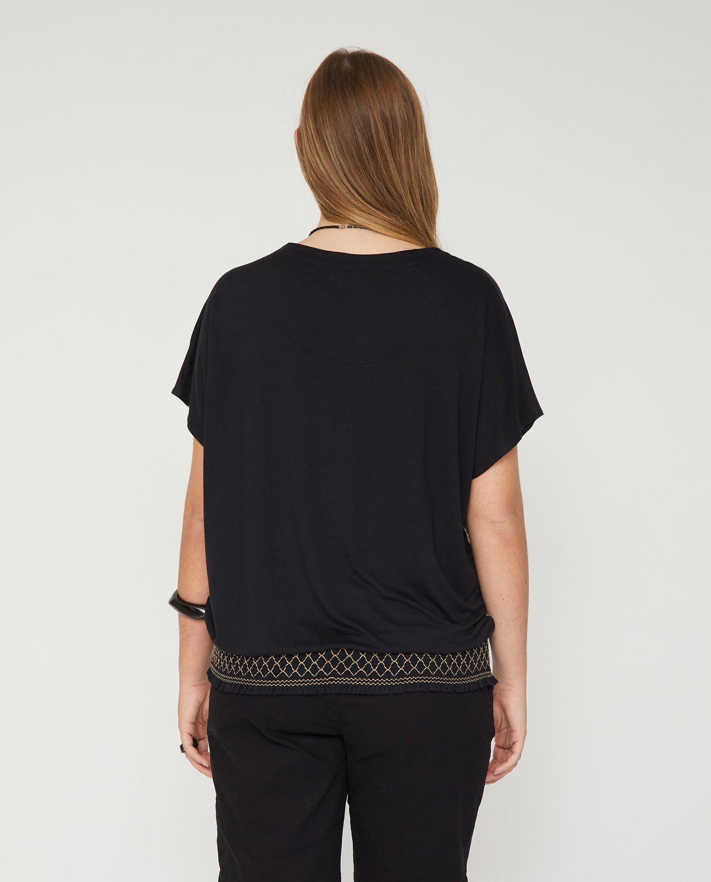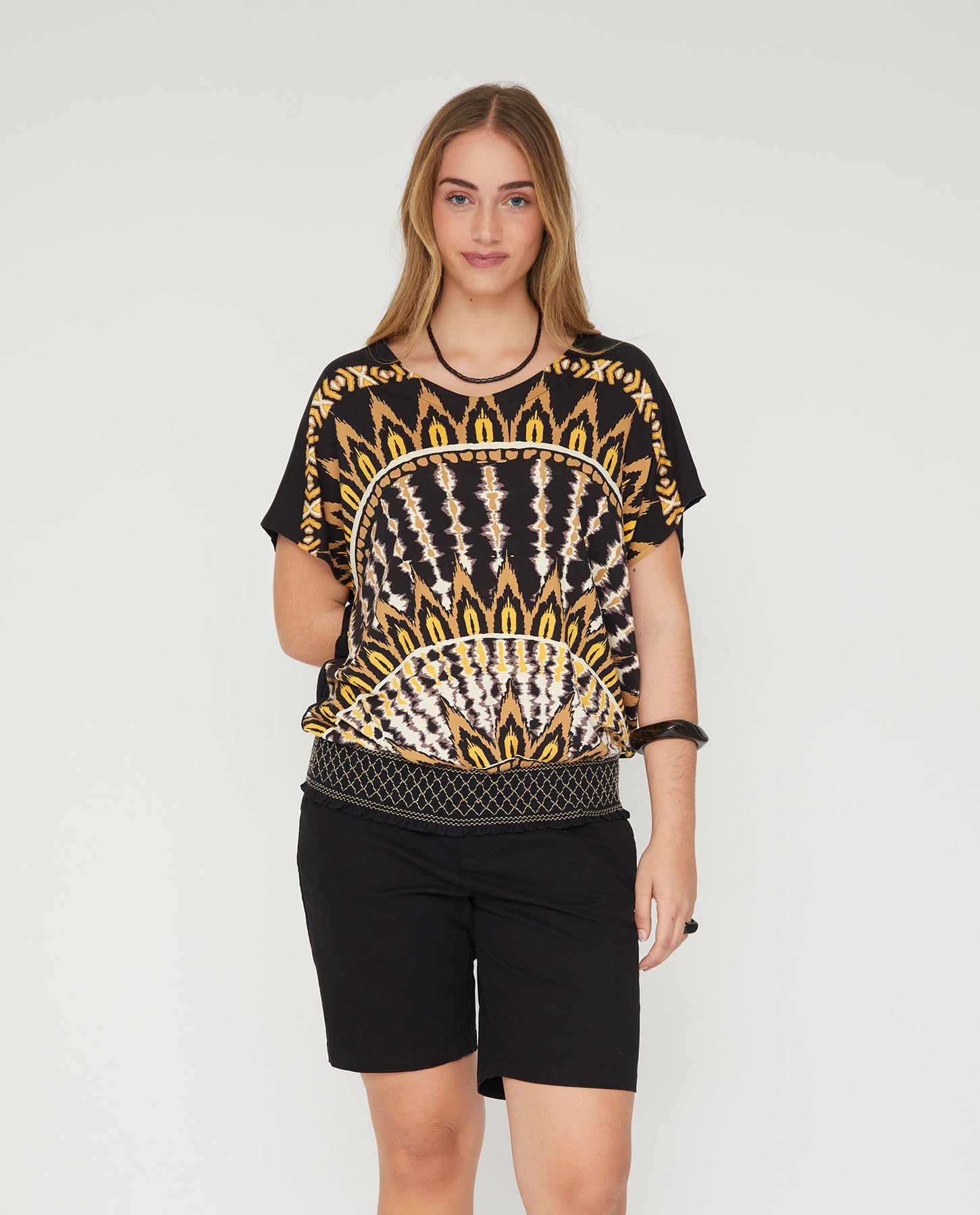 Camiseta escote pico y manga caida. Estampado posiconal en delantero. Detalle de bajo con elástico efecto nido de abeja.