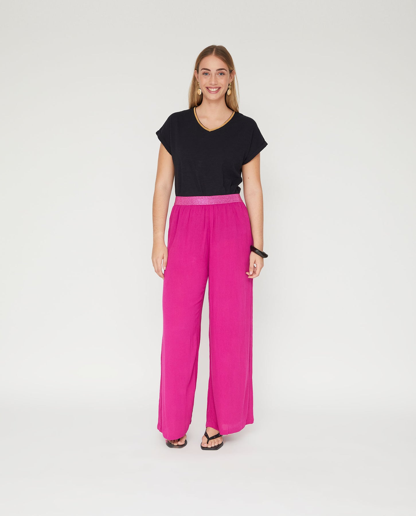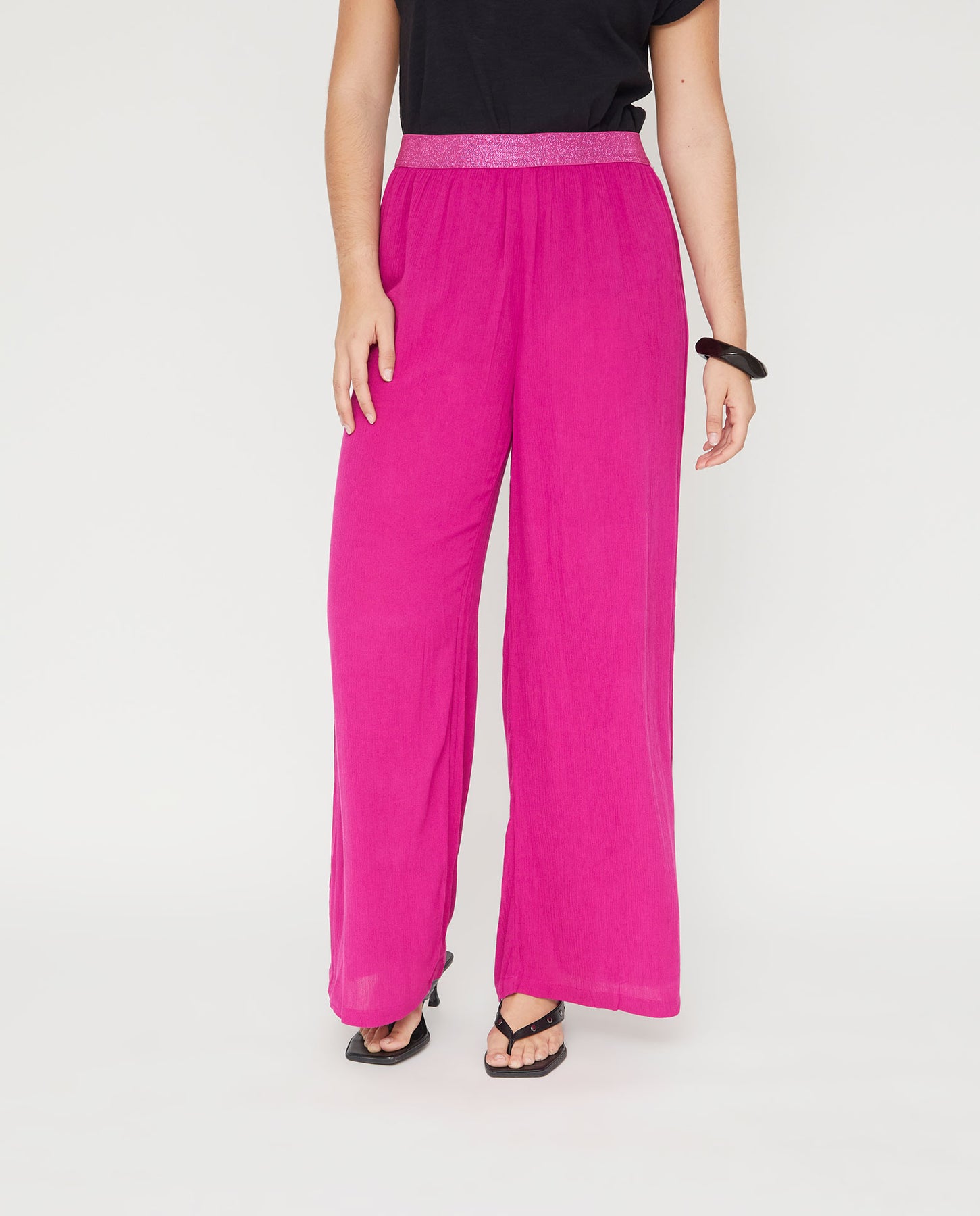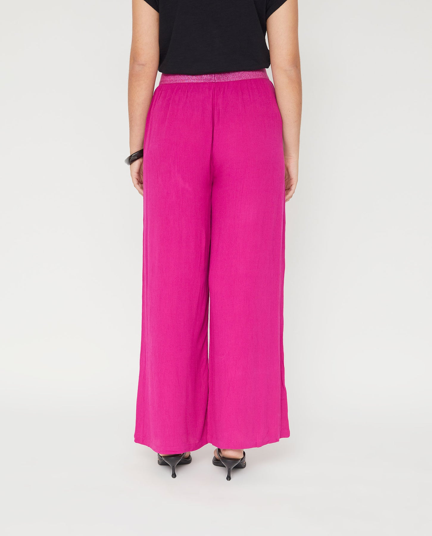 Pantalón largo fluido con elástico de fantasía en la cintura.