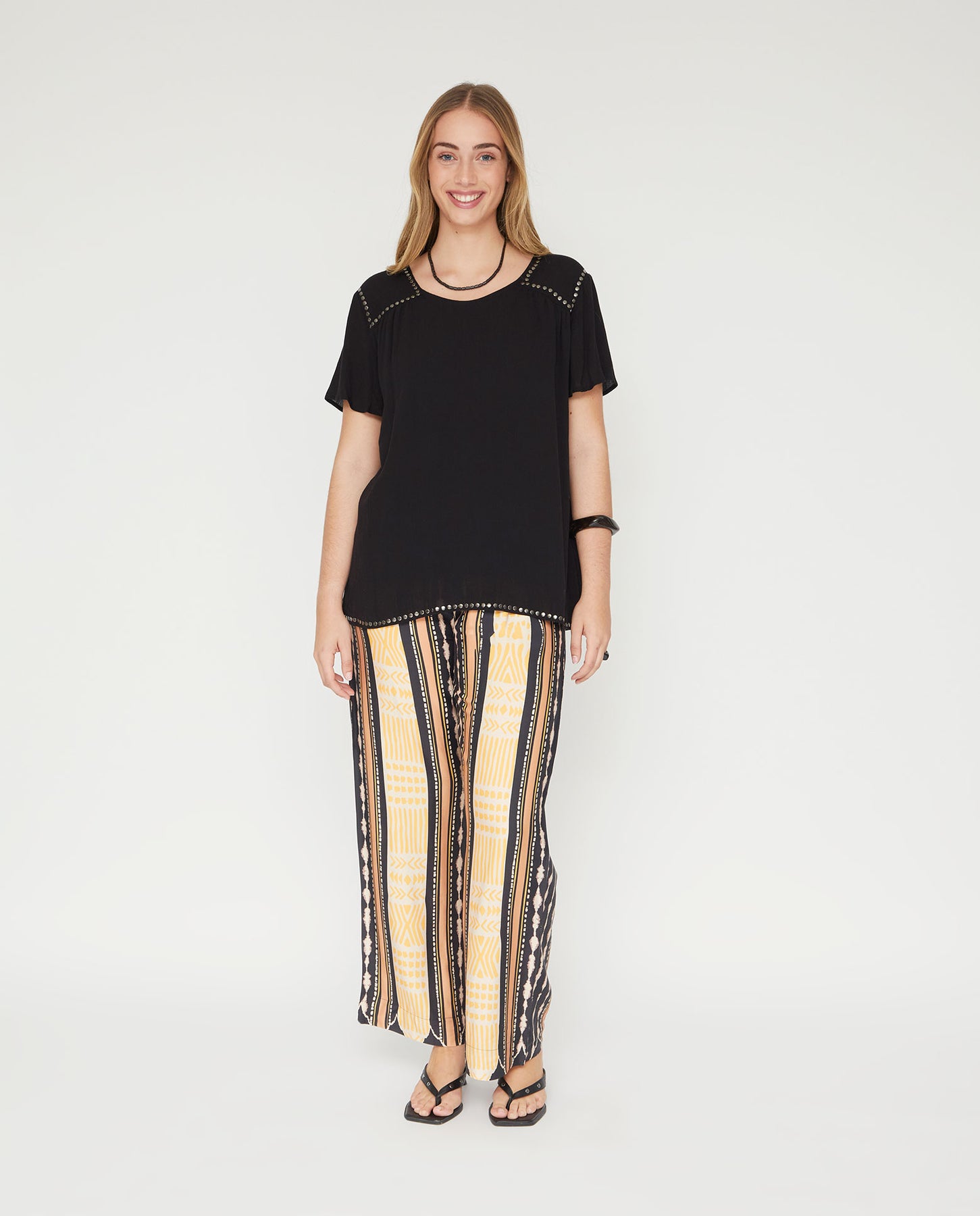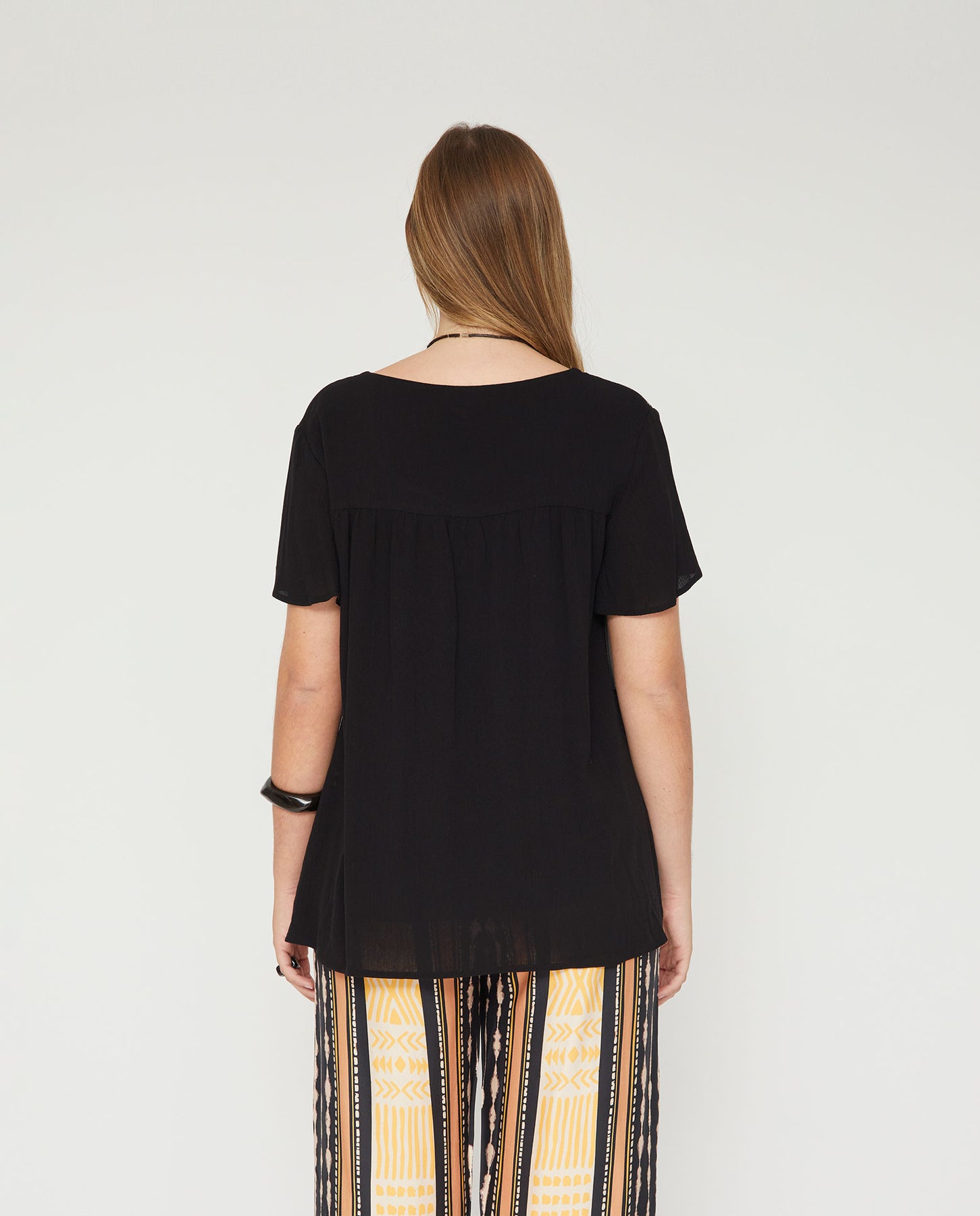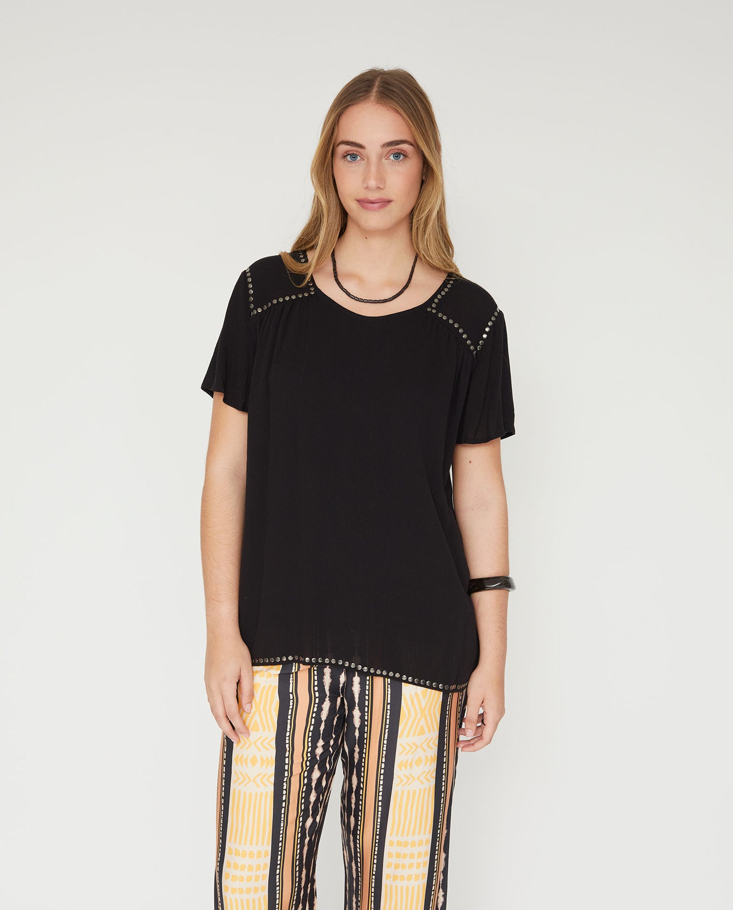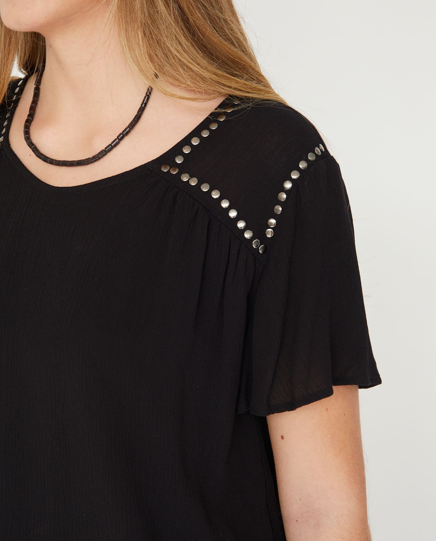 Blusa de bambula con escote pico y manga corta. Aplicación de tachas en canesú delantero y bajo.