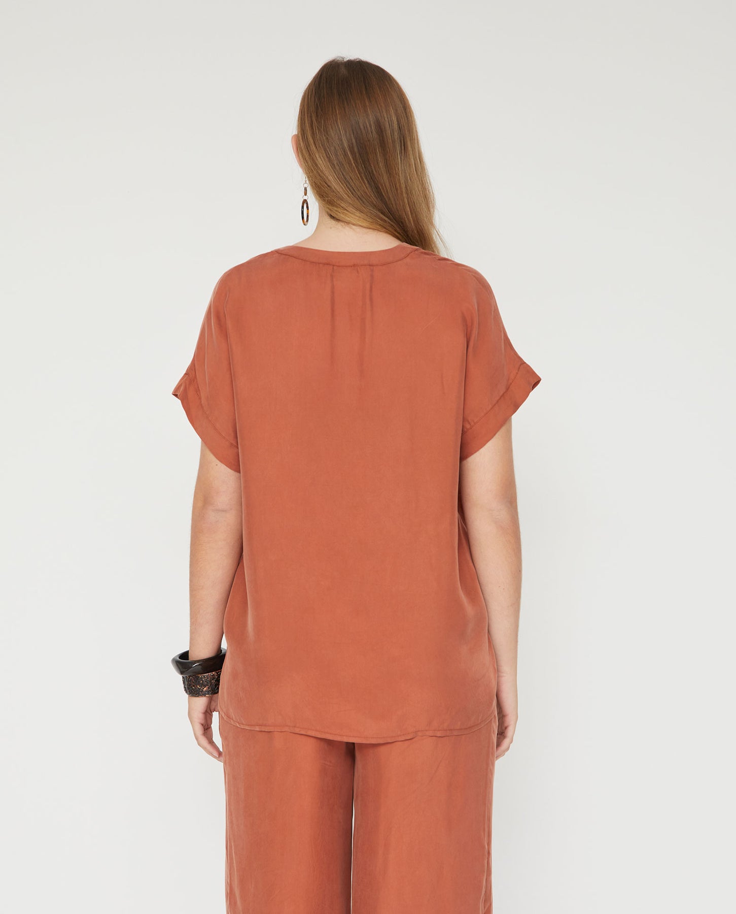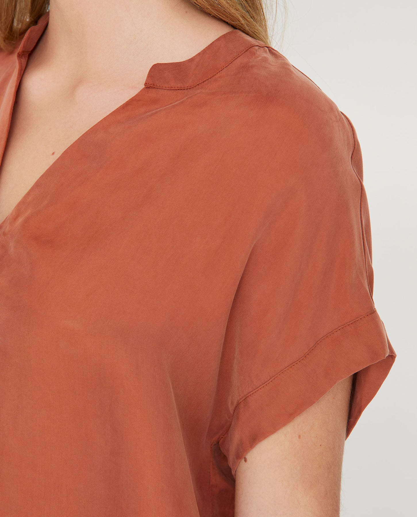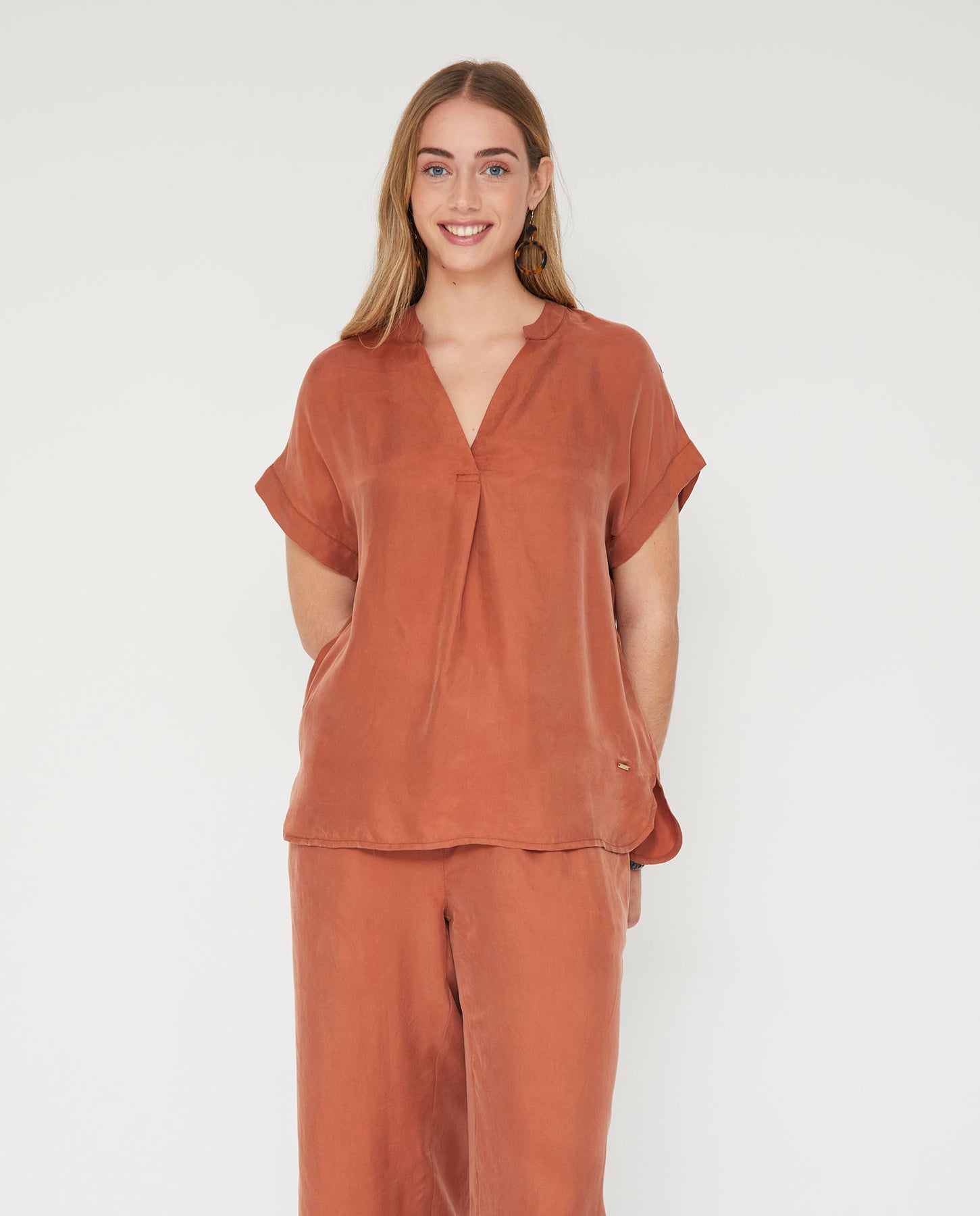 Blusa cuello con abertura en pico, manga corta caída. Detalle de pliegue debajo del escote.