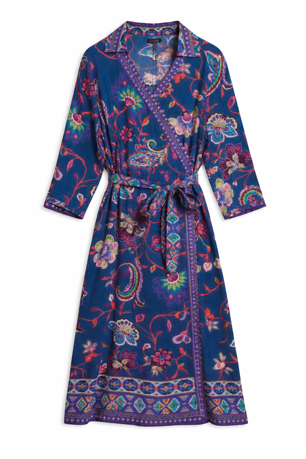 Vestido estampado con cuello solapa. Delantero cruzado con lazada.