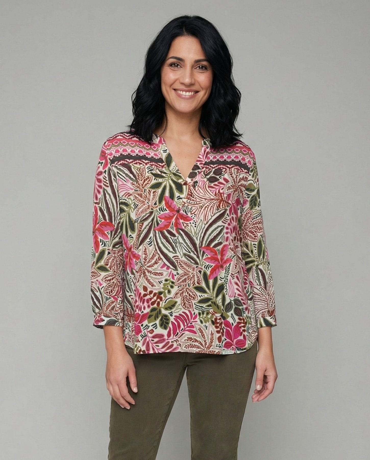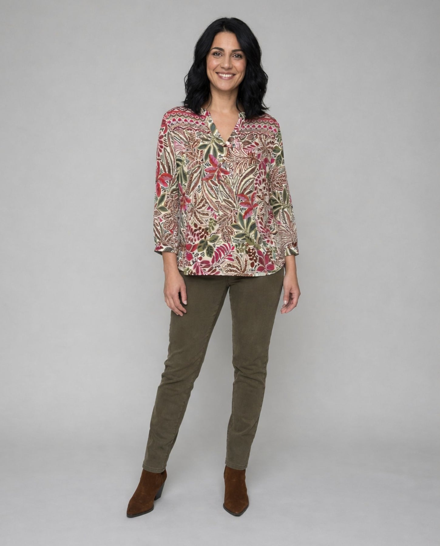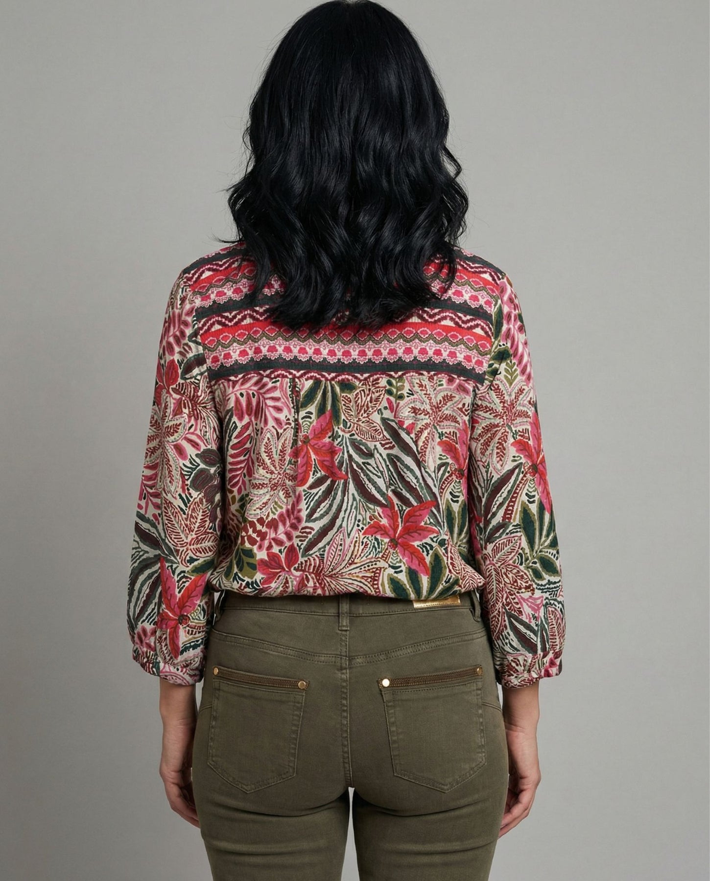 Blusa estampado con cuello mao. Manga tres cuartos y cierre delantero abotonado.