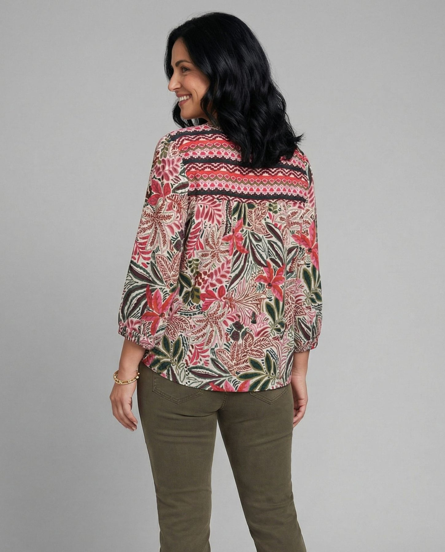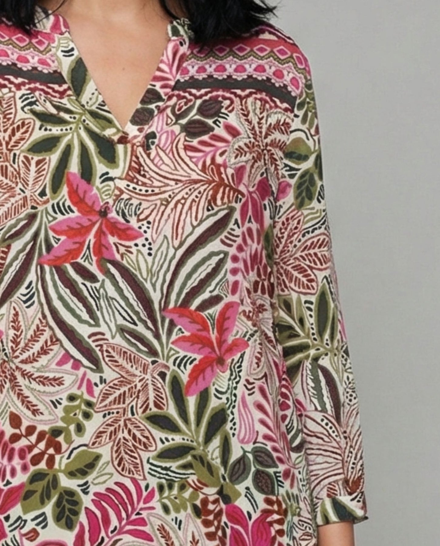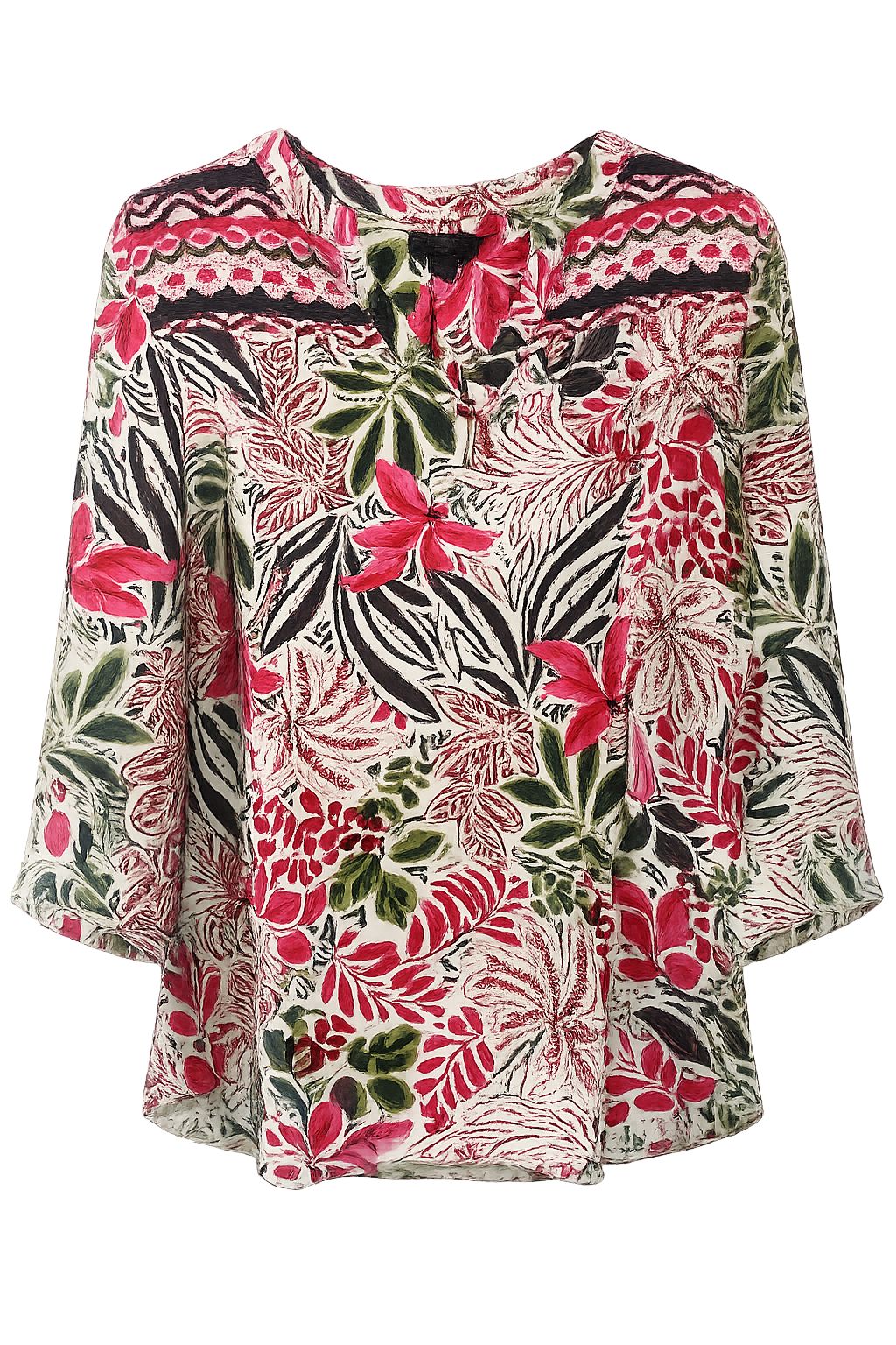 Blusa estampado con cuello mao. Manga tres cuartos y cierre delantero abotonado.