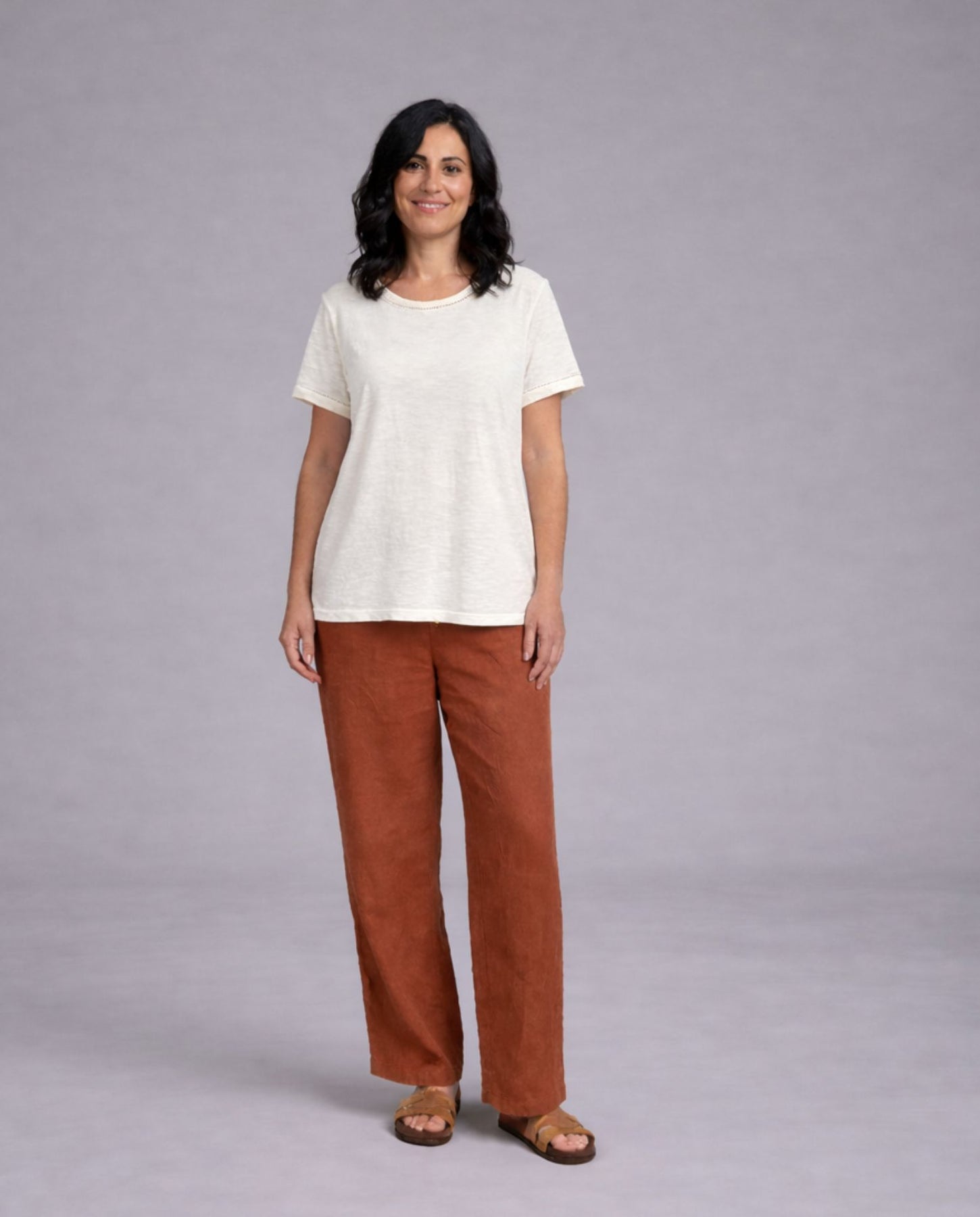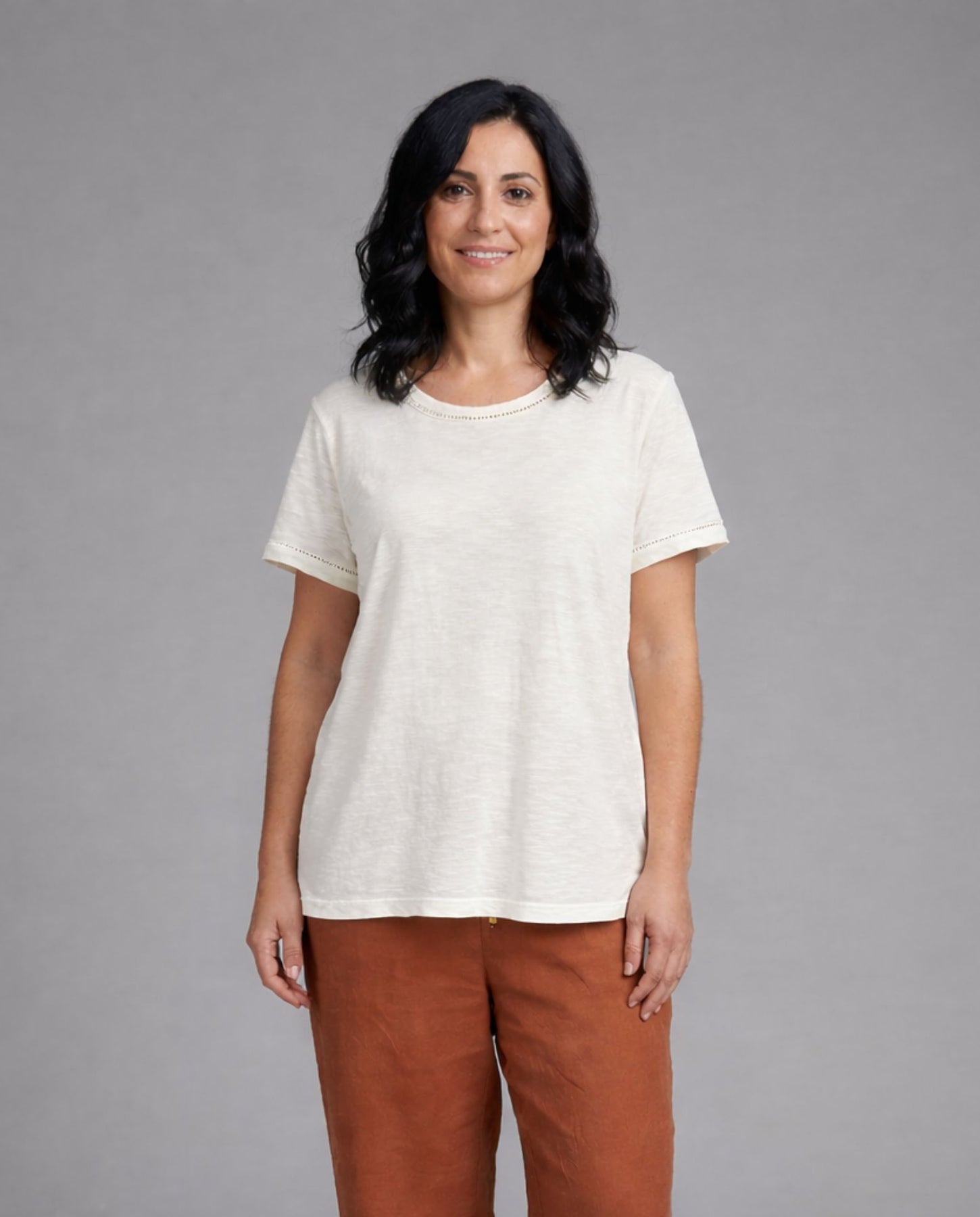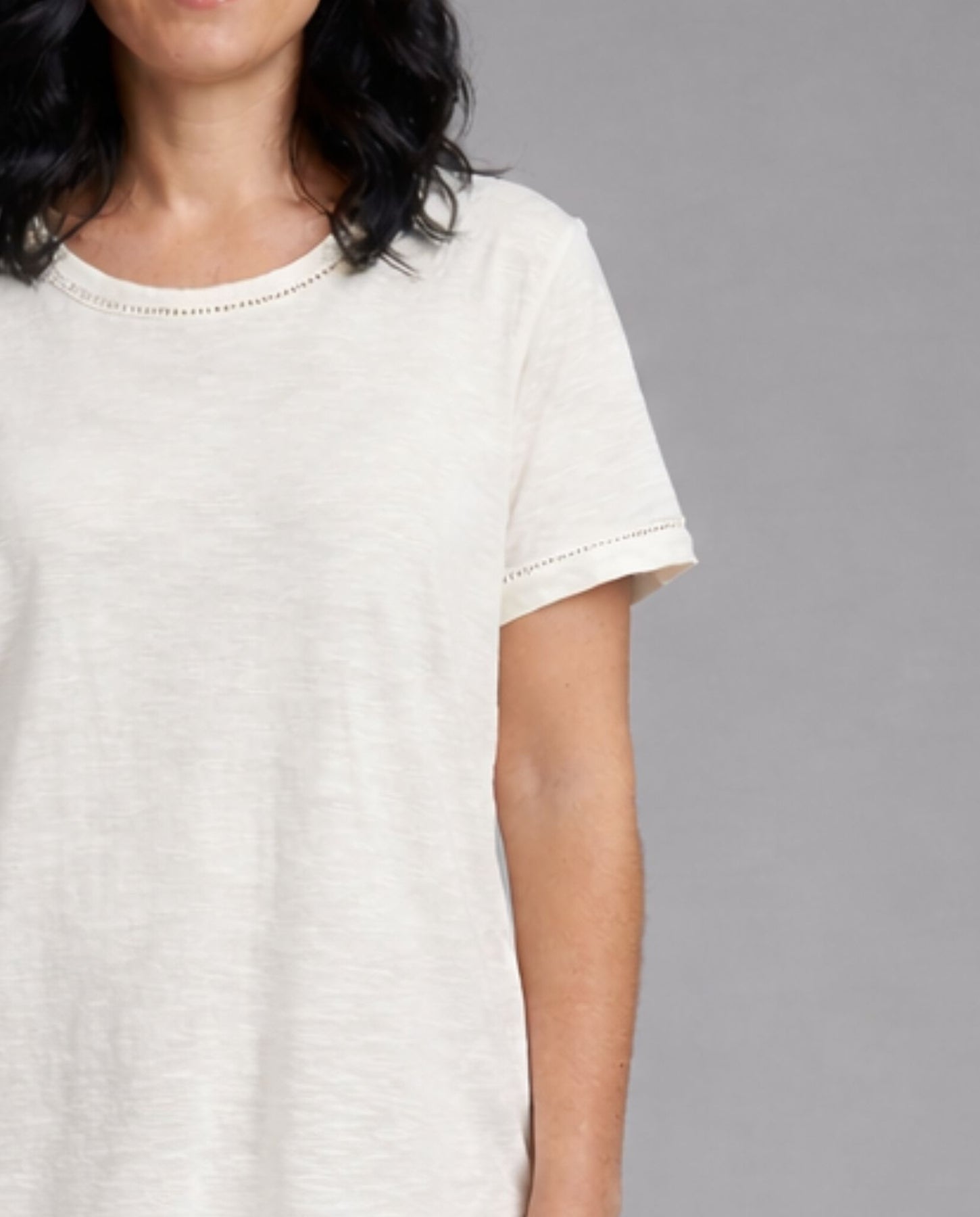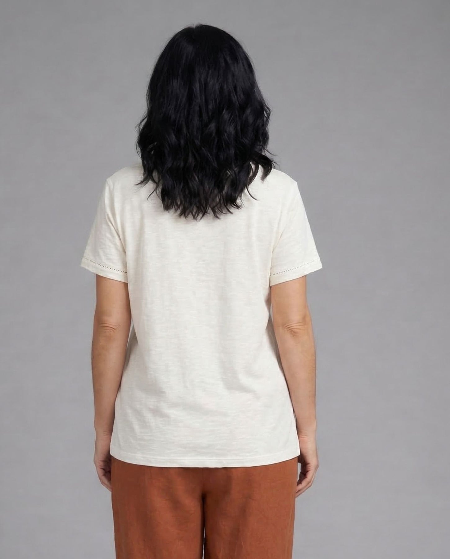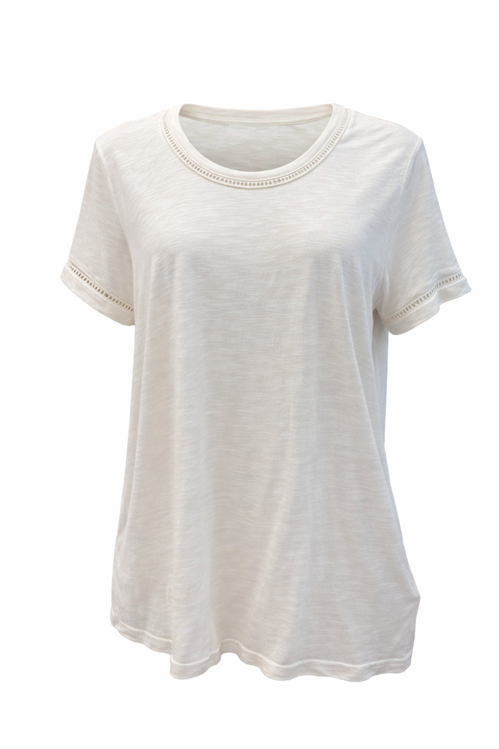 Camiseta escote pico y manga corta. Detalle de entredós en color a tono en cuello y manga.
