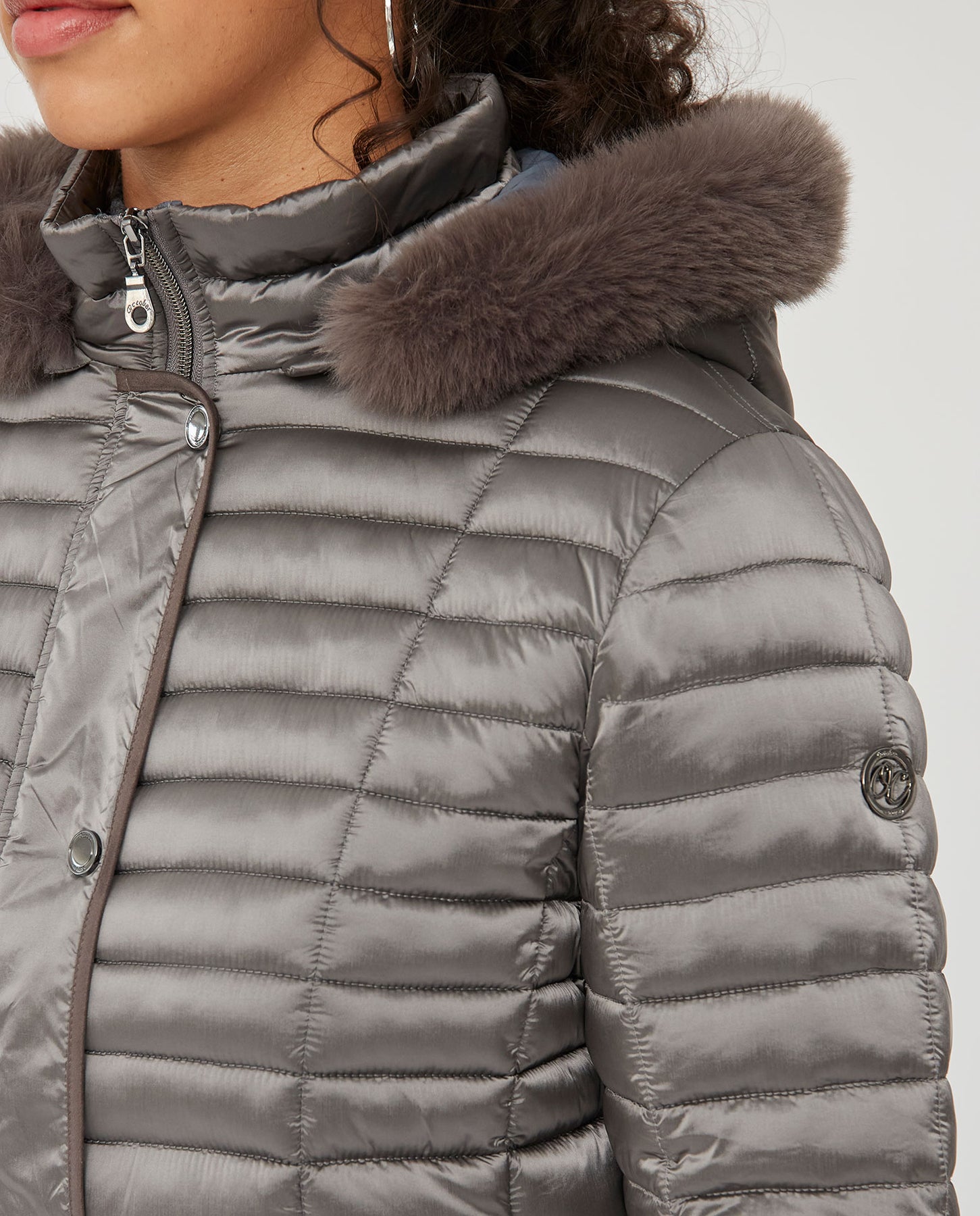 Parka larga acolchada con cuello alto y capucha desmontable. Detalle de pelo sintético en capucha. Acabados en suede ecológica en color de contraste. Bolsillos laterales con cierre de cremallera metálica. Cierre frontal de cremallera oculta por solapa con botones a presión.